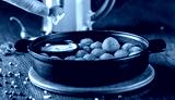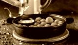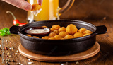 Czech cuisine concept. Potato croquettes. Balls of mashed potatoes, breaded, deep-fried in a cast iron pan. Served with raw sauce. Snack to beer.