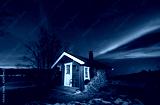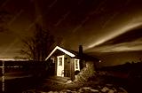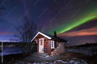 The polar arctic Northern lights aurora borealis sky star in Scandinavia Norway Tromso in the farm winter forest snow mountains with wooden sauna