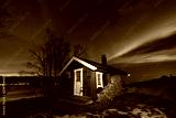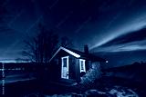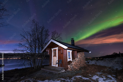 The polar arctic Northern lights aurora borealis sky star in Scandinavia Norway Tromso in the farm winter forest snow mountains with wooden sauna