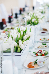 Dinner table serving. White tulips stand in flowerpots on white table served with delicious food