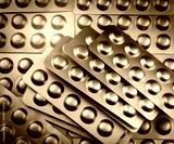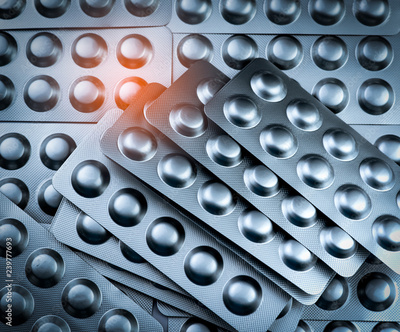 Pile of tablets pill in blister packaging to protect medicine from light. Silver aluminium foil blister pack. Pharmaceutical industry. Pharmacy products. Drug recall and withdrawal from market concept