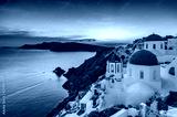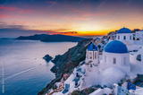 Beautiful view of Churches in Oia village, Santorini island in Greece at sunset, with dramatic sky.