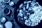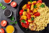 Mexican cuisine. Rice with black sesame. Spicy chicken with curry, paprika, cherry tomatoes and honest. Red Salsa Sauce Serve in a black plate, near spices. Recipe Background Image
