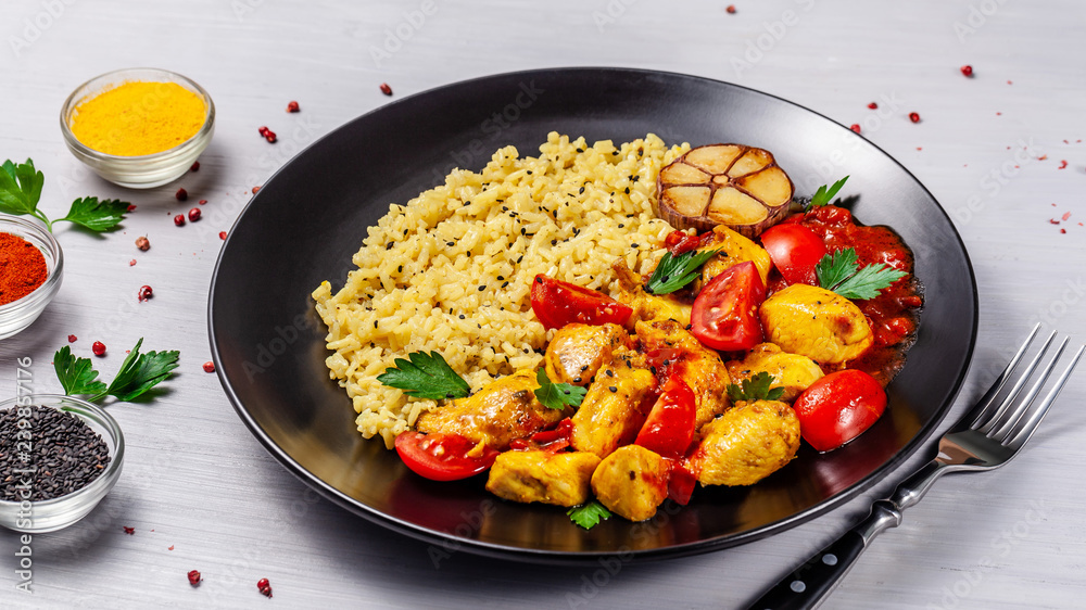 Mexican cuisine. Rice with black sesame. Spicy chicken with curry, paprika, cherry tomatoes and honest. Red Salsa Sauce Serve in a black plate, near spices. Recipe Background Image