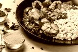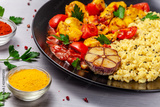 Mexican cuisine. Rice with black sesame. Spicy chicken with curry, paprika, cherry tomatoes and honest. Red Salsa Sauce Serve in a black plate, near spices. Recipe Background Image