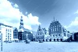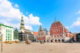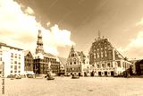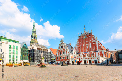 View of the Old Town square, Roland Statue, The Blackheads House near St Peters Cathedral against blue sky in Riga, Latvia. Summer sunny day