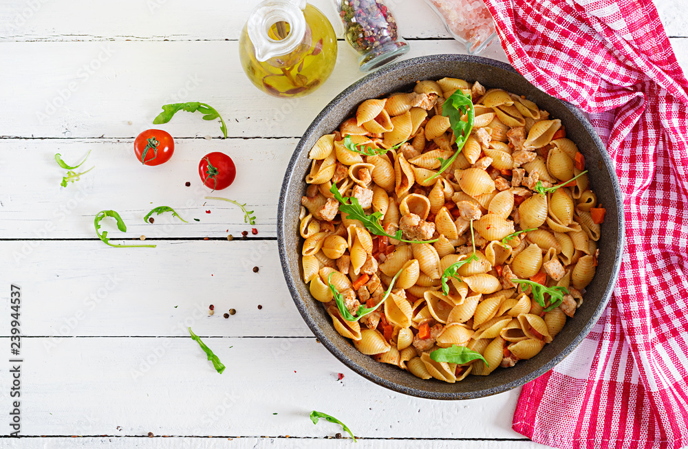 Italian pasta shells with meat and tomato sauce. Conchiglie pasta. Top view
