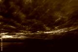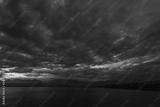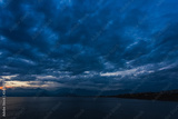 Beautiful sunset cloudy sky and dark sea water with silhouettes of mountains in background. Night is coming. Horizontal color photography.