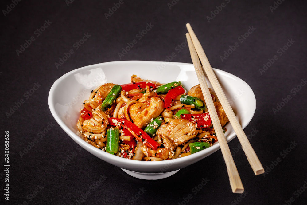 Concept of Asian cuisine. Wheat noodles from durum flour with vegetables and chicken. Carrots, bell peppers, green beans, white and black sesame. Japanese or Chinese dish.