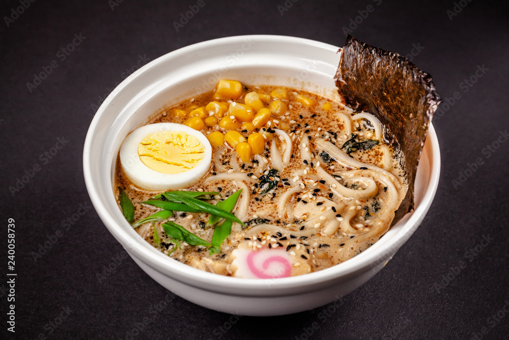 Concept of Asian cuisine. Ramen soup with Chinese noodles, egg, corn, green onions and fish seasoning. Japanese or Chinese dish.