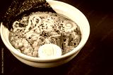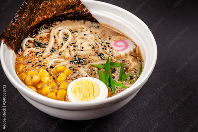 Concept of Asian cuisine. Ramen soup with Chinese noodles, egg, corn, green onions and fish seasoning. Japanese or Chinese dish.