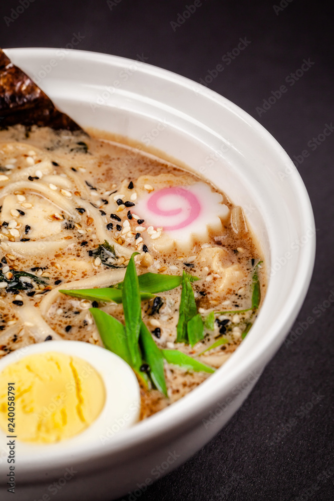 Concept of Asian cuisine. Ramen soup with Chinese noodles, egg, corn, green onions and fish seasoning. Japanese or Chinese dish.