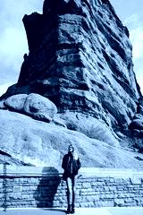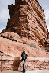 Young Beautiful Modern Caucasian Woman Smiling While Traveling to Red Rocks Park in United States Outside in Nature at the State Park with Ancient Stone and Blue Sky Background