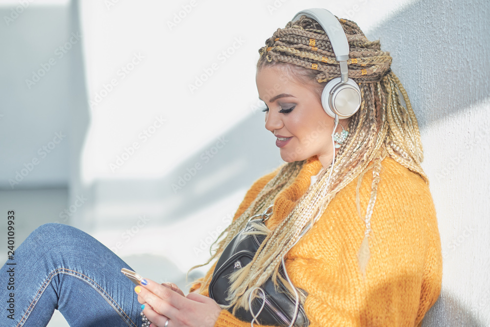 beautiful young girl chooses a song in a playlist, concept of listening to music with headphones