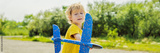 Happy kid playing with toy airplane against old runway background. Traveling with kids concept BANNER, LONG FORMAT