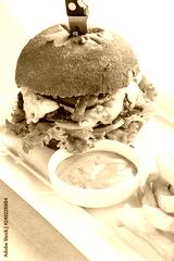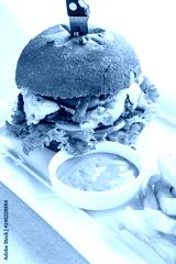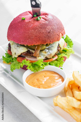 beetroot red bun cheeseburger set with fries and chilli mayo