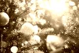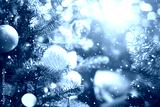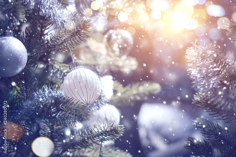 Christmas holiday background. Silver bauble hanging from a decorated on tree with bokeh and snow, copy space.