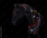 Beautiful black horse posing in a christmas image on a black background