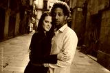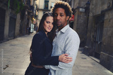 Una pareja feliz y enamorada interracial en las calles de Barcelona pasando un día bonito.