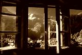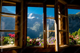 Alps in summer morning. Gimmelwald, Lauterbrunnen, Switzerland, Alps mountain landscape through the window. Europe Swiss.