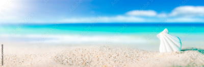 Seashell On Sandy Beach With Tropical Water, Sun, Blue Sky And Fluffy White Clouds - Beach Holiday Concept