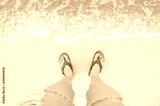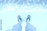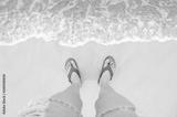 Feet with sandals shoes on sea sandy beach and clear wave