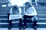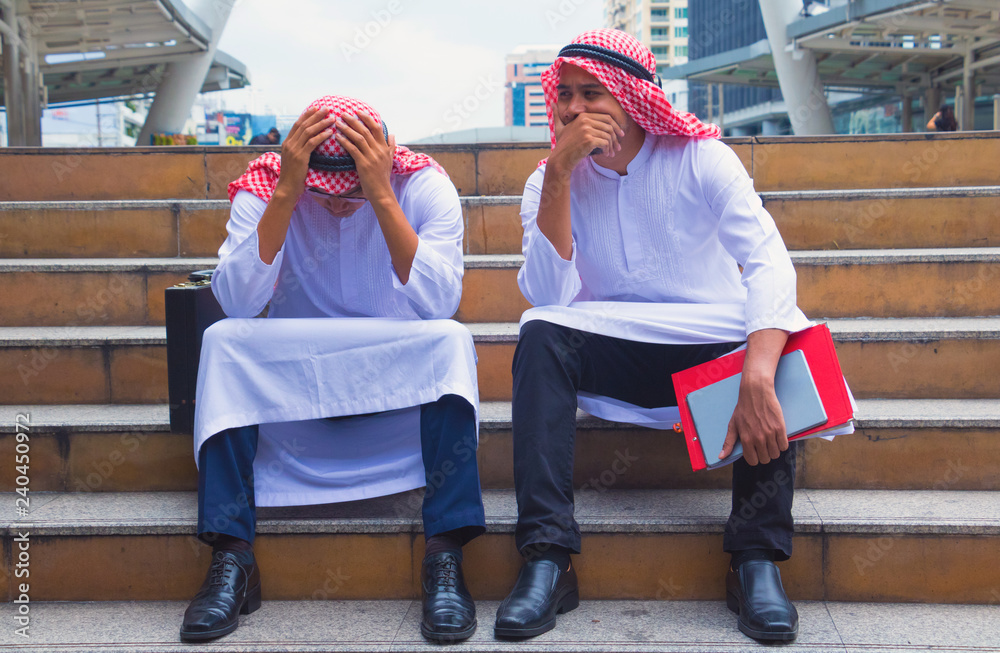 In the staircase. Islamic Business man crying. They are Sorry from losing business.They are Enormous loss. Photo concept Business .