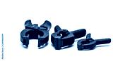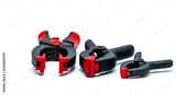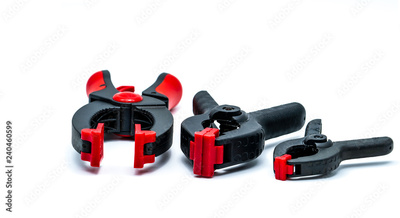 Black and orange spring clamp isolated on white background. Set of small, medium, and big size of plastic clamp. Clamping tools for carpentry work. Hand tools for handicraft. Clamping equipment.
