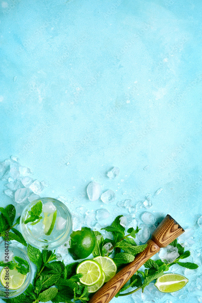 Homemade citrus lemonade mojito with ingredients for making.Top view with copy space.