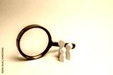 families stand near a magnifying glass. The concept of finding a new home, affordable housing for young families. The standard of living and education, the search for a better life.