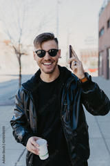 Young Happy Millennial Male Business Man Entrepreneur in Urban Downtown Metropolis on His Cell Phone Texting and Taking Business Phone Calls on Walking Commute While Sipping Coffee Beverage To Go