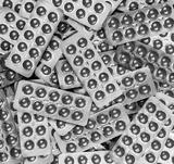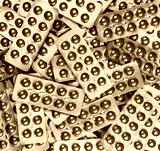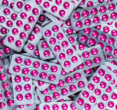 Pile of round pink tablets pill in blister pack. Pharmaceutical industry. Pharmacy products. Prescription drug. Painkiller medicine. Ibuprofen for treatment headache, high fever, migraine. NSAIDs drug