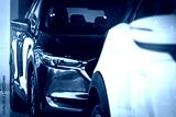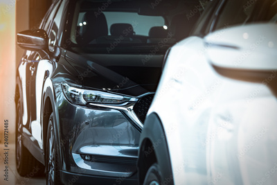 New luxury shiny SUV compact car parked in modern showroom. Car dealership office. Car retail shop. Electric car technology and business concept. Automobile rental concept. Automotive industry.