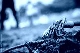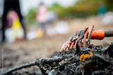 Closeup orange rake on pile of dirty waste on blurred background of volunteer clean up beach. Beach environmental pollution concept Tidying up rubbish on beach. Ocean garbage. Coast polluted.