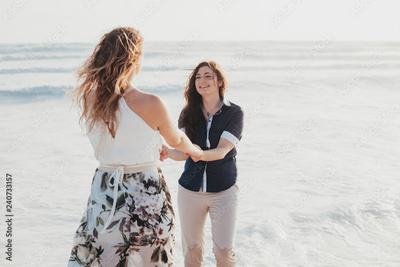 Young couple in love walking on the deserted beach on a summer evening. Two women hold hands by the sea