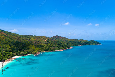 Aerial view of beautiful island at Seychelles in the Indian Ocean. Top view from drone