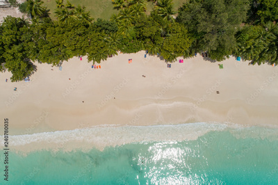 Aerial view of sandy beach with tourists swimming in beautiful clear sea water