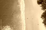 Aerial view of sandy beach with tourists swimming in beautiful clear sea water