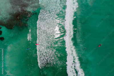 Surfers in tropical ocean waiting wave. Aerial view made with drone