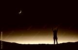 Person with raised arms silhouetted against the sunset and crescent moon.