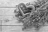 Lavender flowers with heart on wooden background