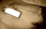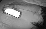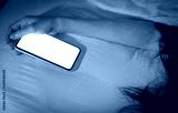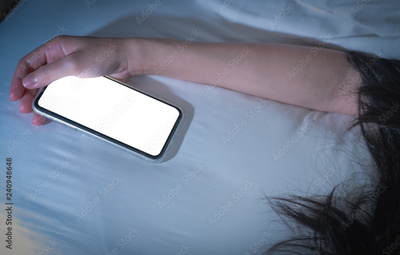 Working woman sleeping in bed at home and hand holding blank screen mobile phone. Woman using smartphone in bedroom. Young woman addicted using smartphone. Texting on cellphone with tired until sleep.