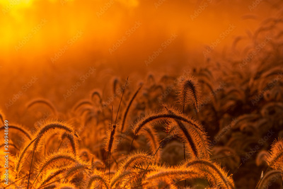 Grass flower in the morning at sunrise with golden sunshine. Flower field in rural. Orange meadow background. Wild meadow grass flowers with morning sunlight. Start new day or new life concept.