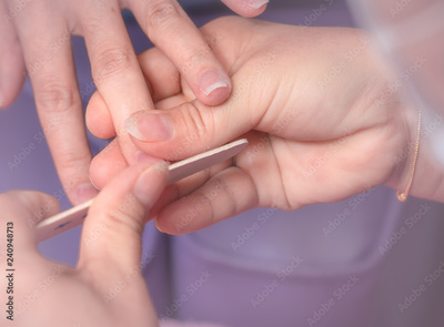 Asian woman receiving fingernail manicure service by professional manicurist at nail salon. Beautician file nail manicure at nail and spa salon. Hand care and fingernail treatment at nail salon.