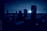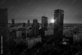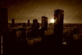 Krajobraz miasta Warszawy z wieżowcami, na tle zachodu słońca