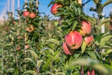 Sad owocowy z jabłoniami. Dojrzałe, czerwone jabłka