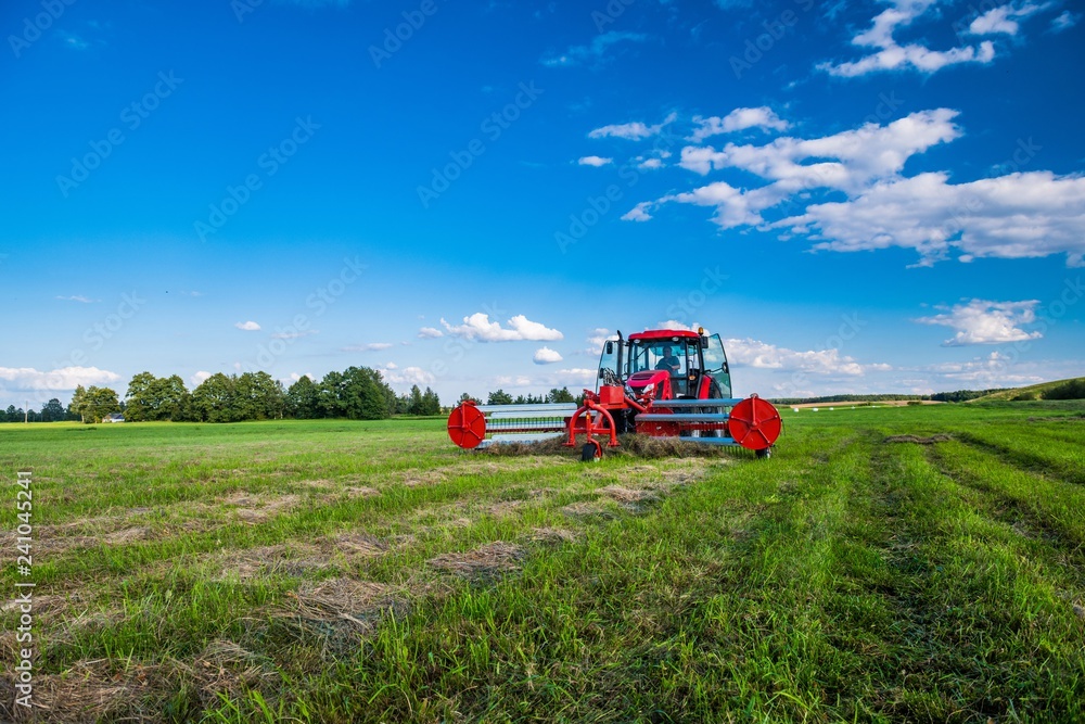Czerwony traktor podczas zbioru siana. Baloty. Lato