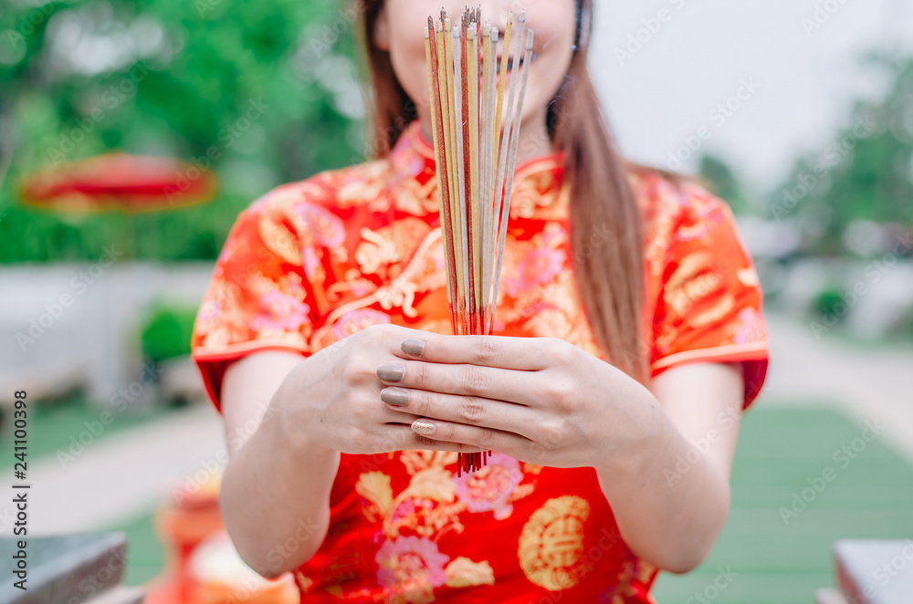 Cute chinese girl dressing traditional red Cheongsam suit burning incense sticks and pay respect and praying to Chinese God for lucky