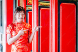 Chinese girl in traditional Chinese cheongsam pointing at china temple and introduce something to you in chinese new year .