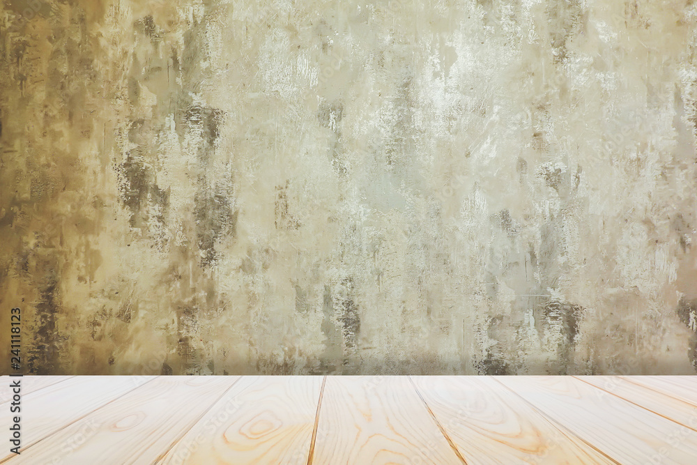 TBackground with empty wooden deck table over grunge cement wall, vintage, background, template, display